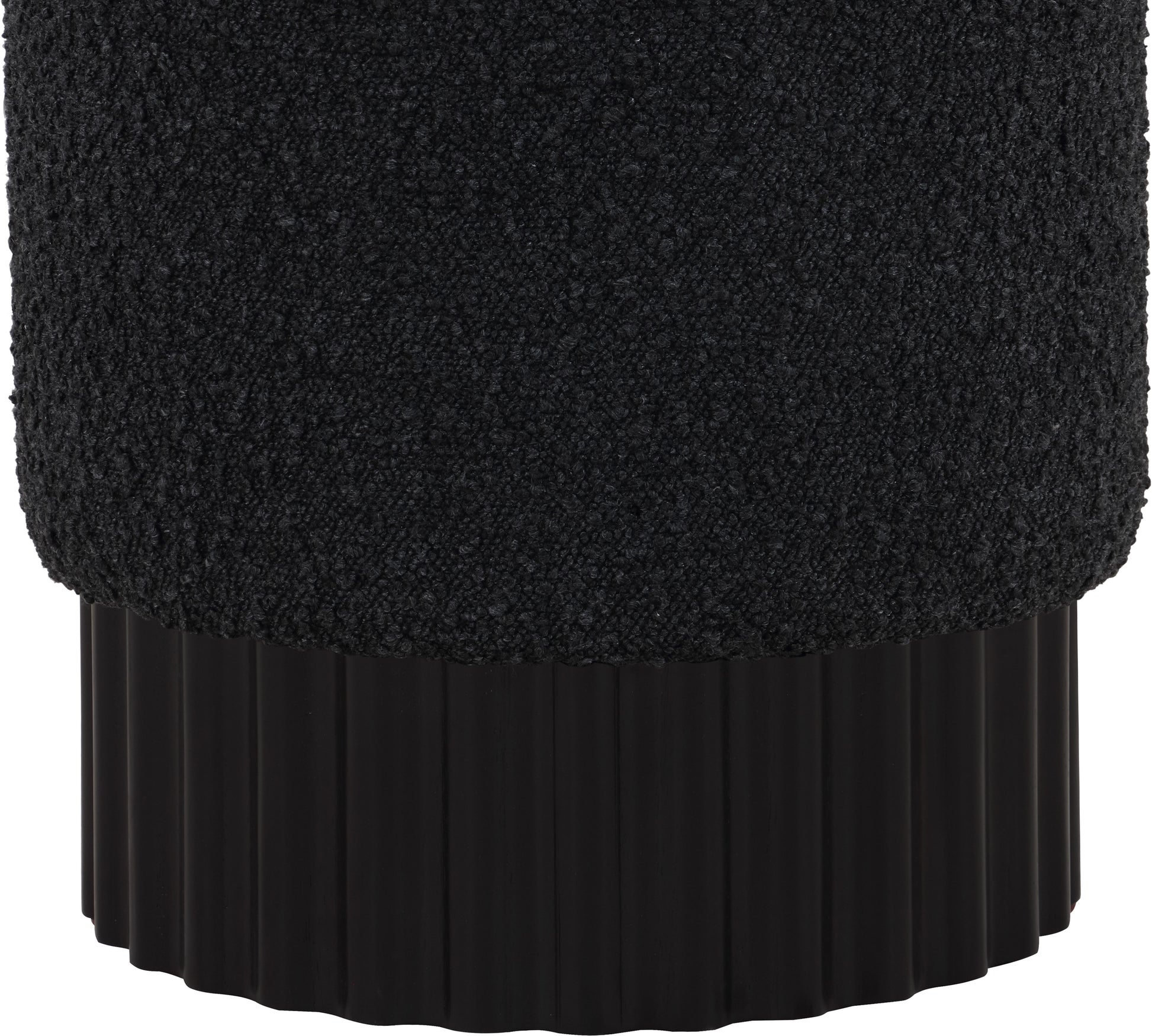 Indulge in the luxurious texture of the Denise Boucle Fabric Ottoman/Stool. It boasts a rich black boucle fabric that is paired with an elegant and sturdy solid wood base, featuring a black finish that highlights the beautiful wood grain patterns.
