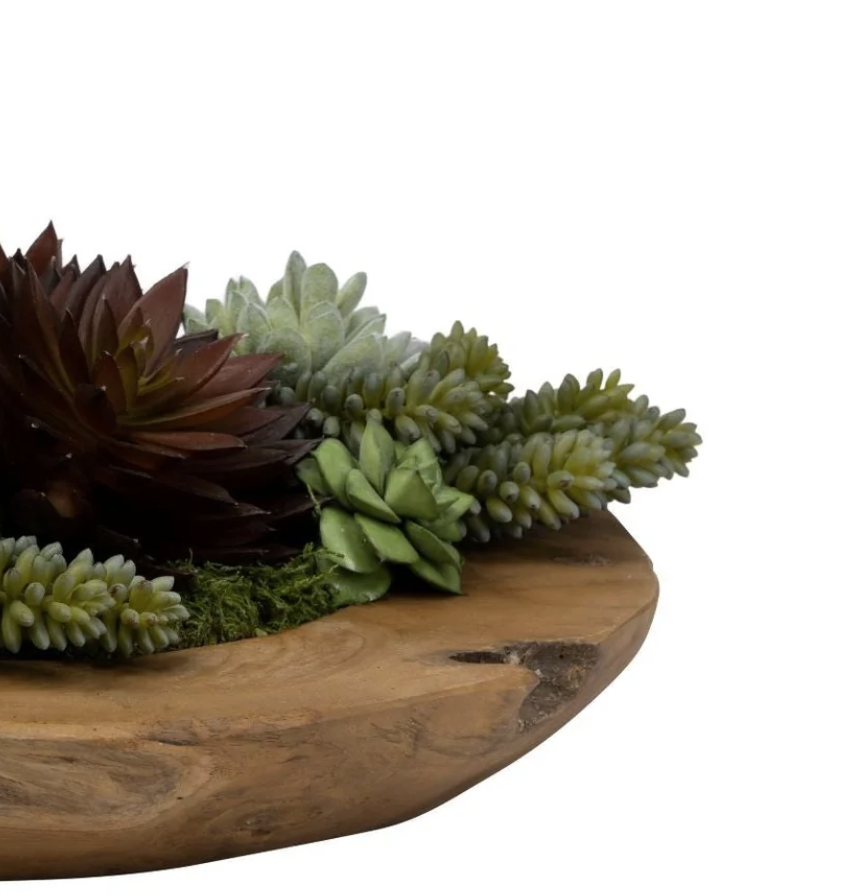 "Expertly crafted from rich teak wood and filled with lifelike succulent greenery, this eye-catching centerpiece brings effortless organic beauty to any room. With its warm, earthy tones and lush mixed succulents, it’s perfect for adding a touch of refined nature to living rooms, dining tables, or office spaces.